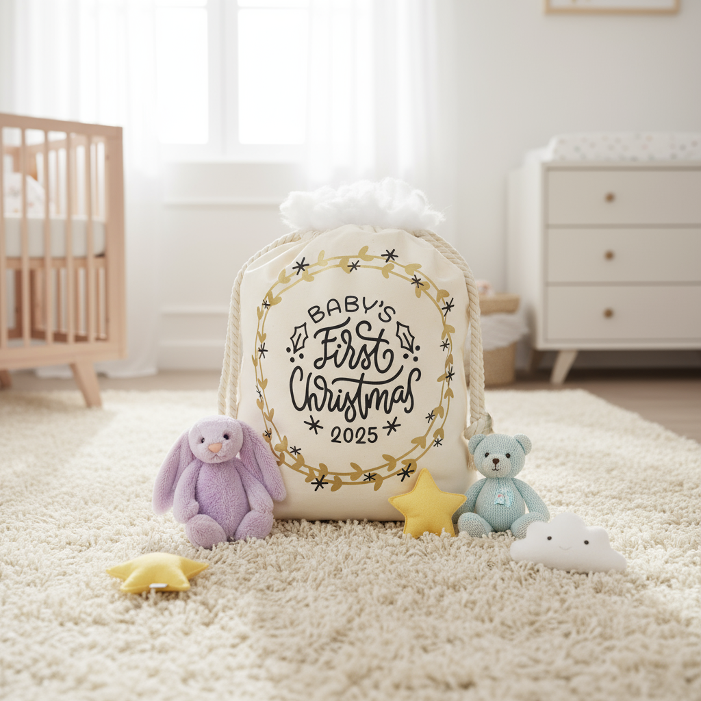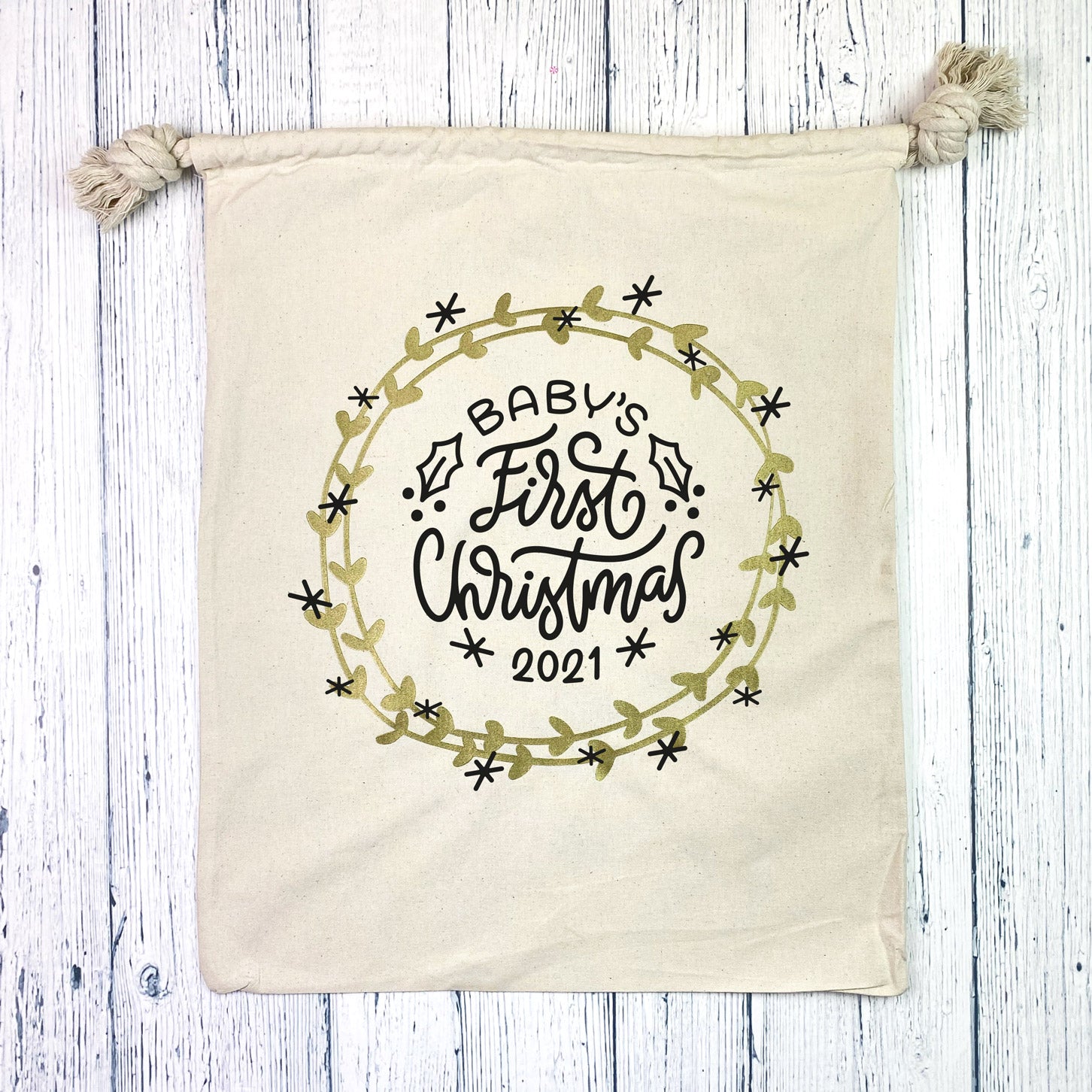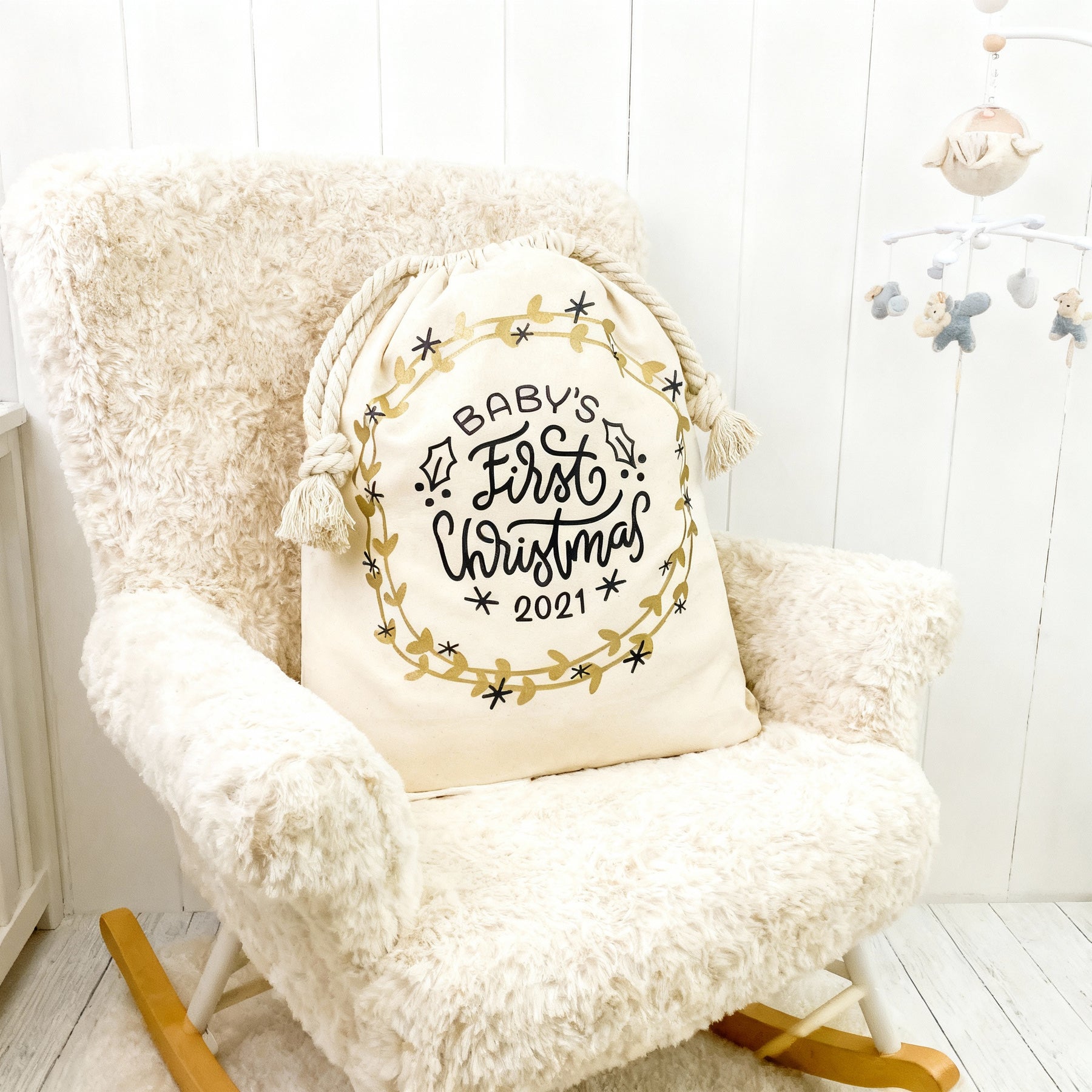 Based on our original Santa Sacks but a little different. Designed to celebrate a huge milestone in your new baby's life. Fill with gifts and necessities for your little one.