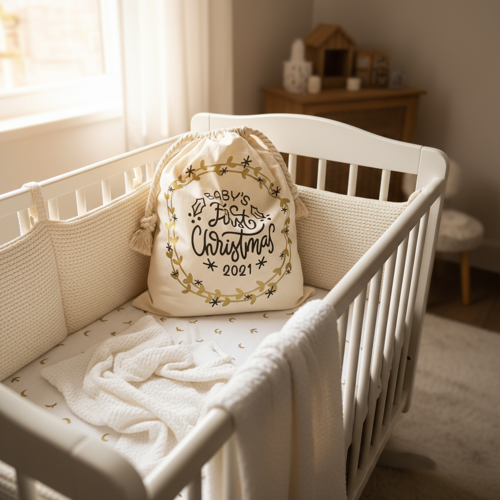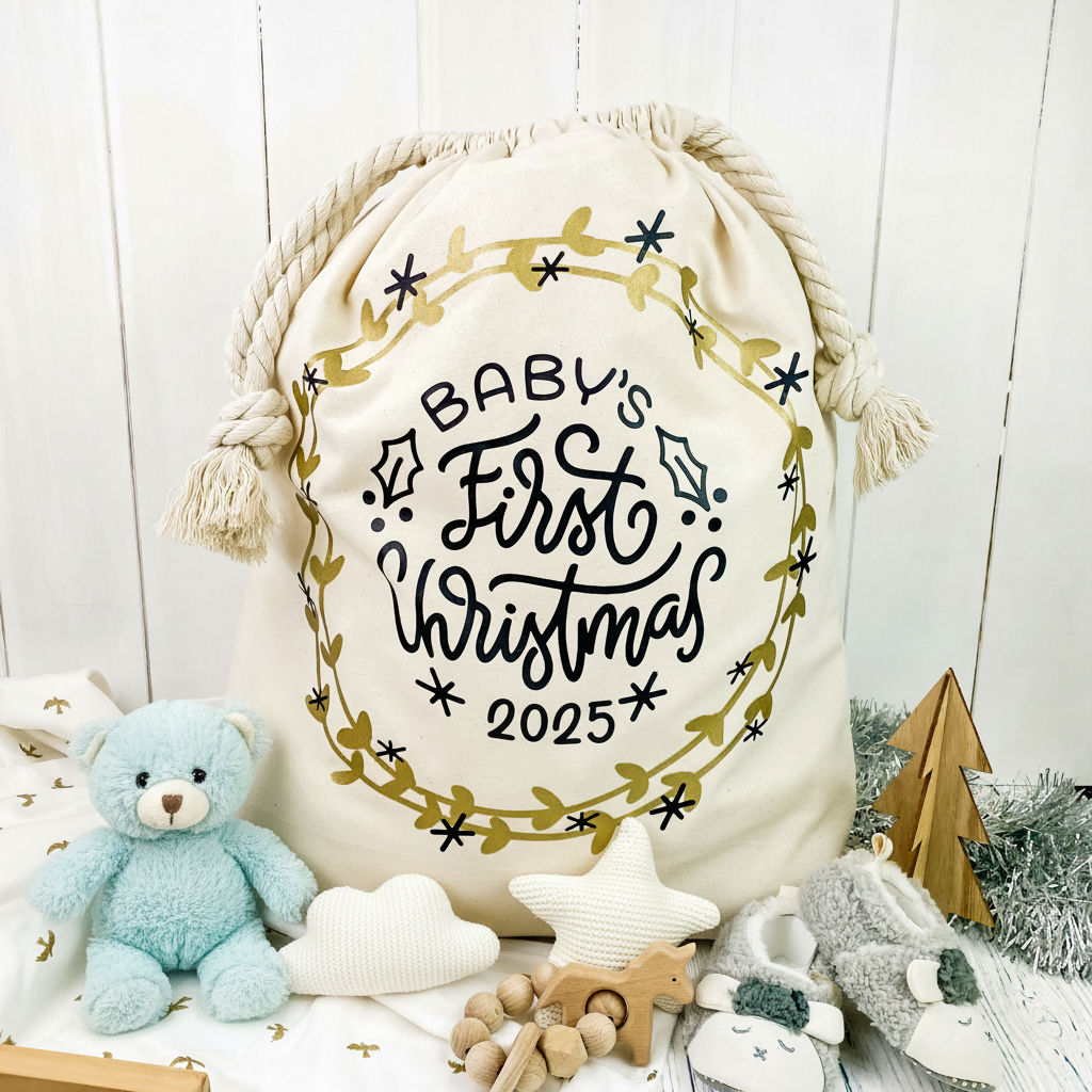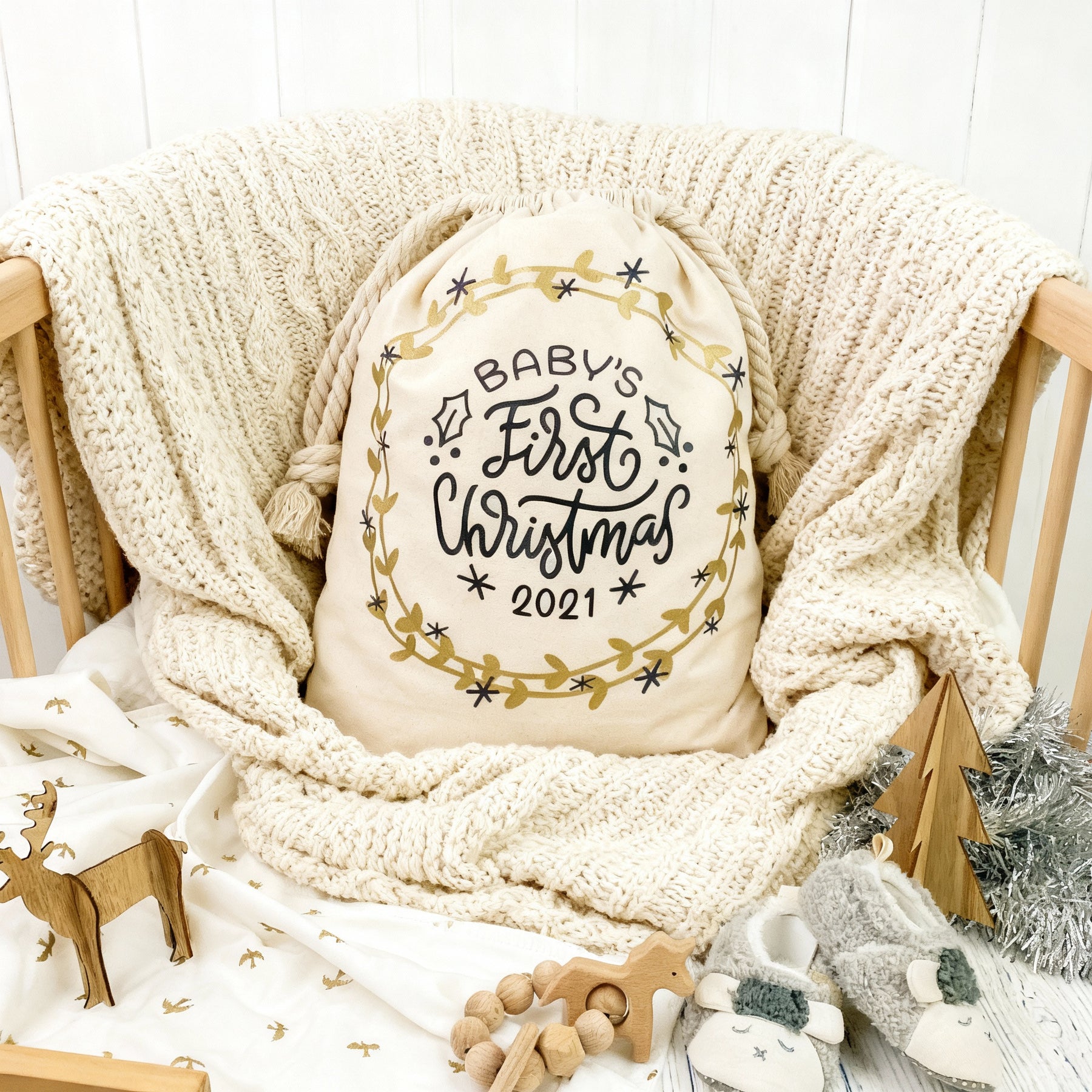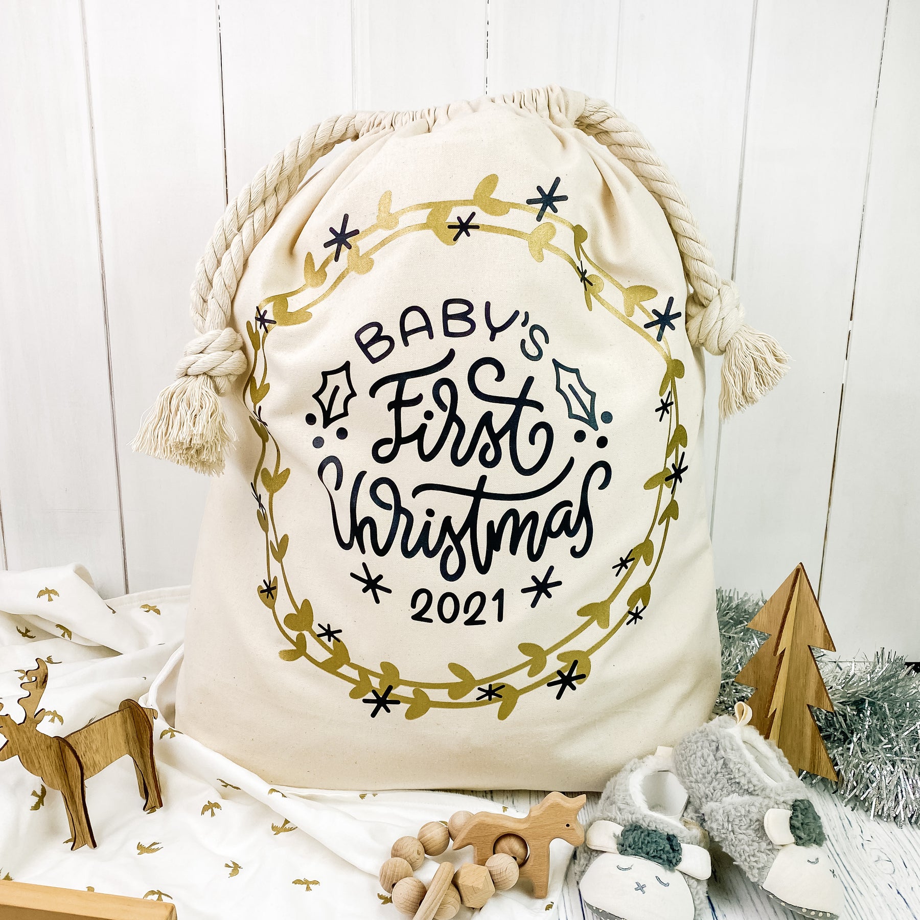 Based on our original Santa Sacks but a little different. Designed to celebrate a huge milestone in your new baby's life. Fill with gifts and necessities for your little one.