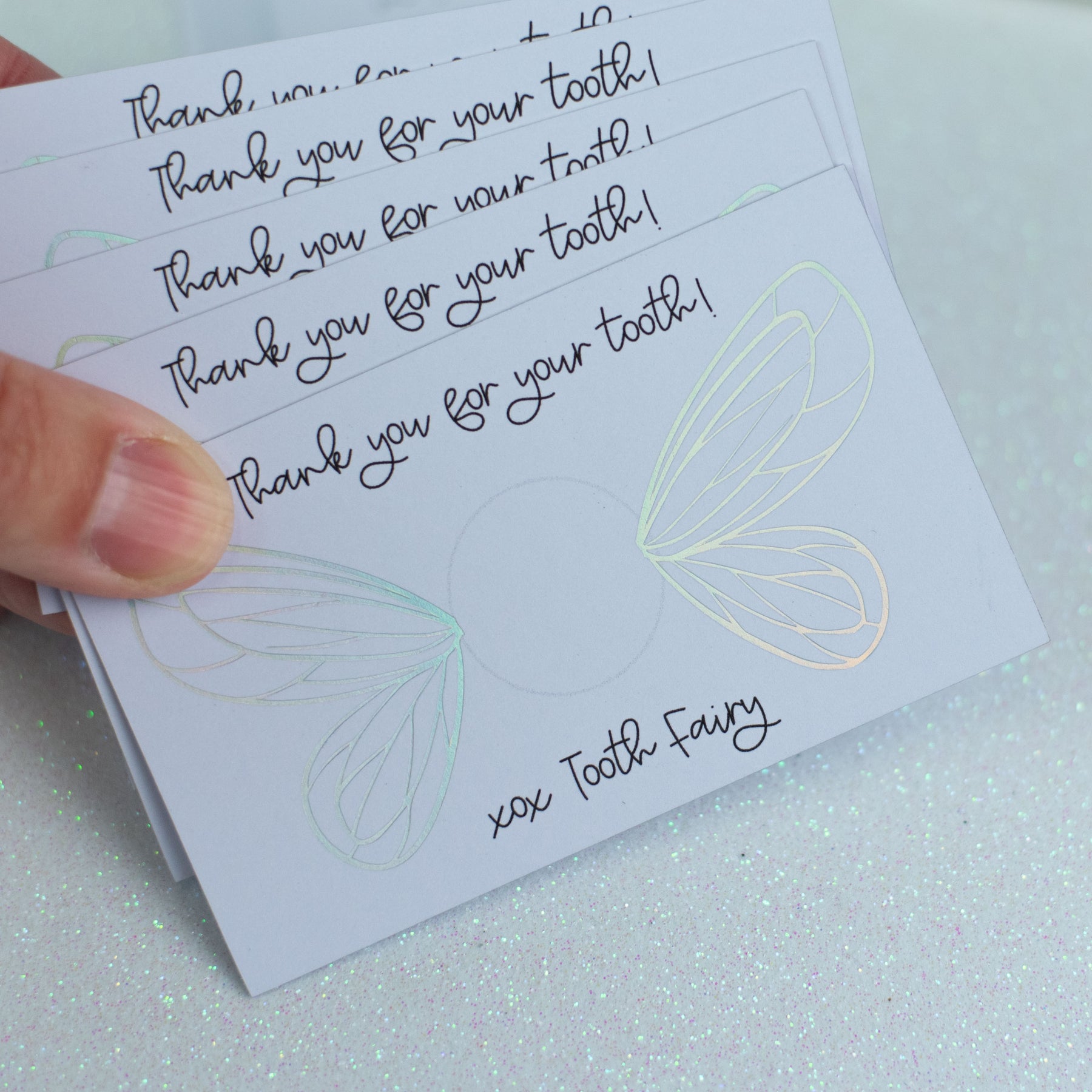 Designed to hold Tooth Fairy coins, featuring delicate holographic foil wings and edges for a subtle magical touch.