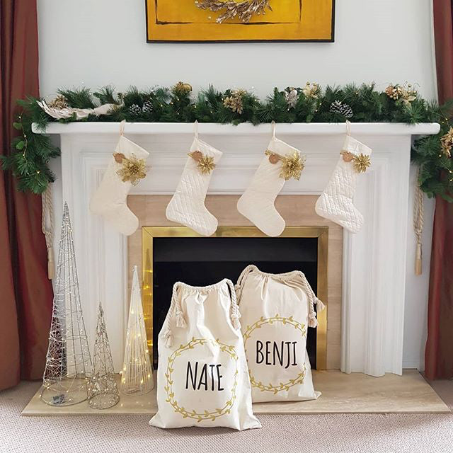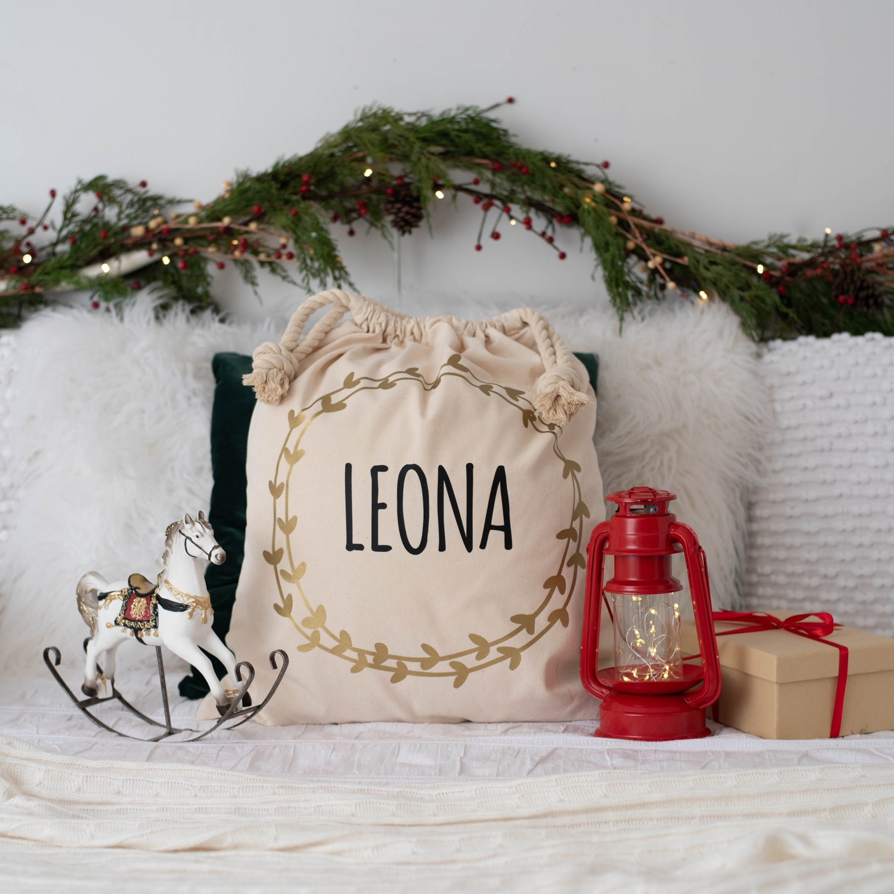 Our famous Santa Sacks in Gold Wreath look stunning next to the Christmas tree on Christmas morning. Personalised with your the name of your choice on one side.