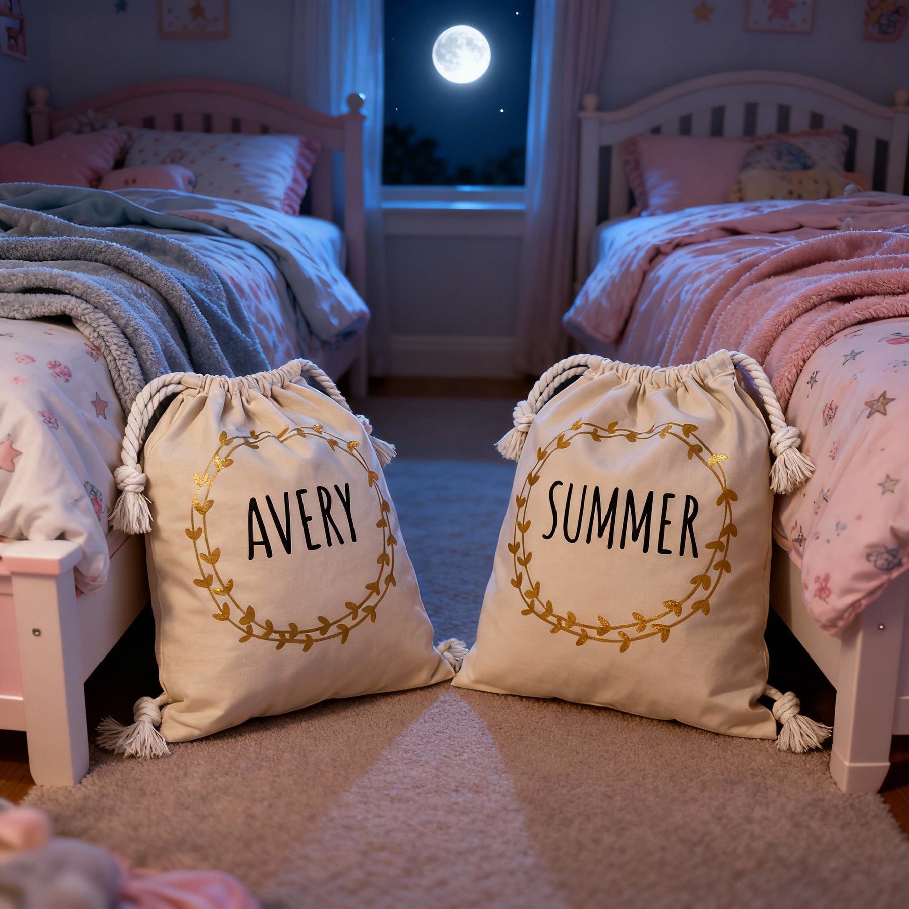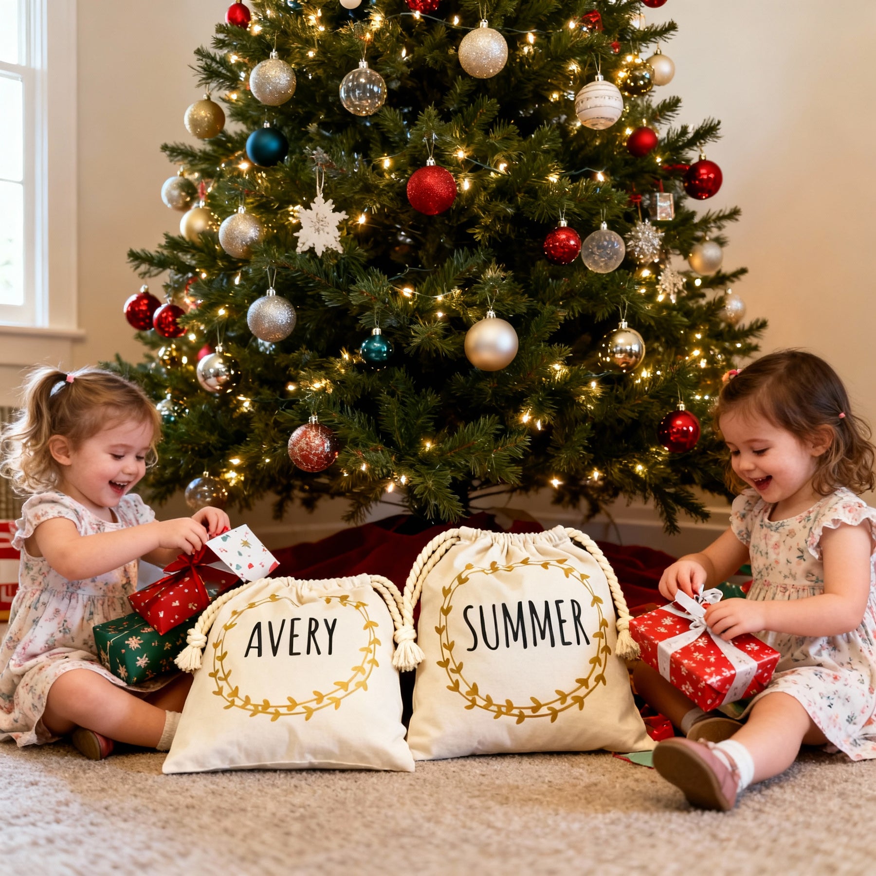 Our famous Santa Sacks in Gold Wreath look stunning next to the Christmas tree on Christmas morning. Personalised with your the name of your choice on one side.